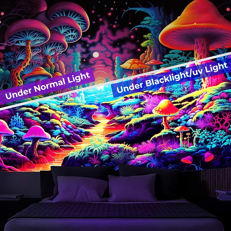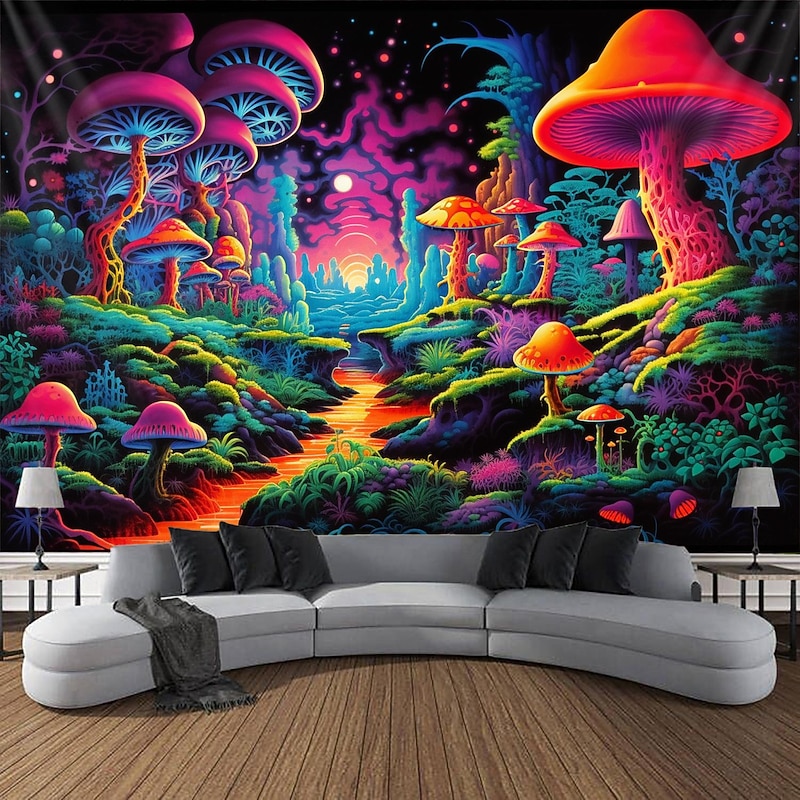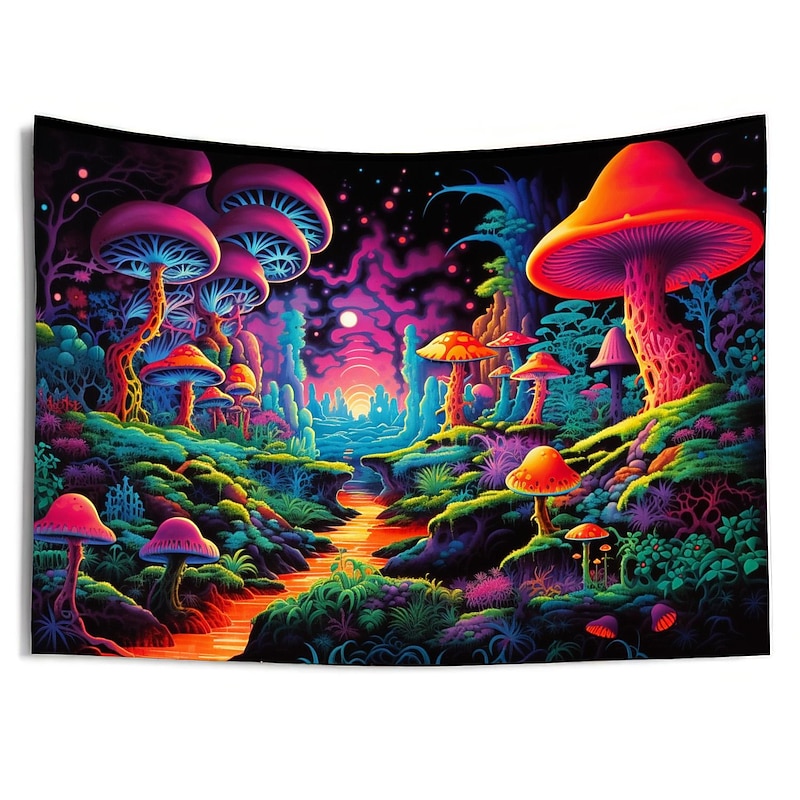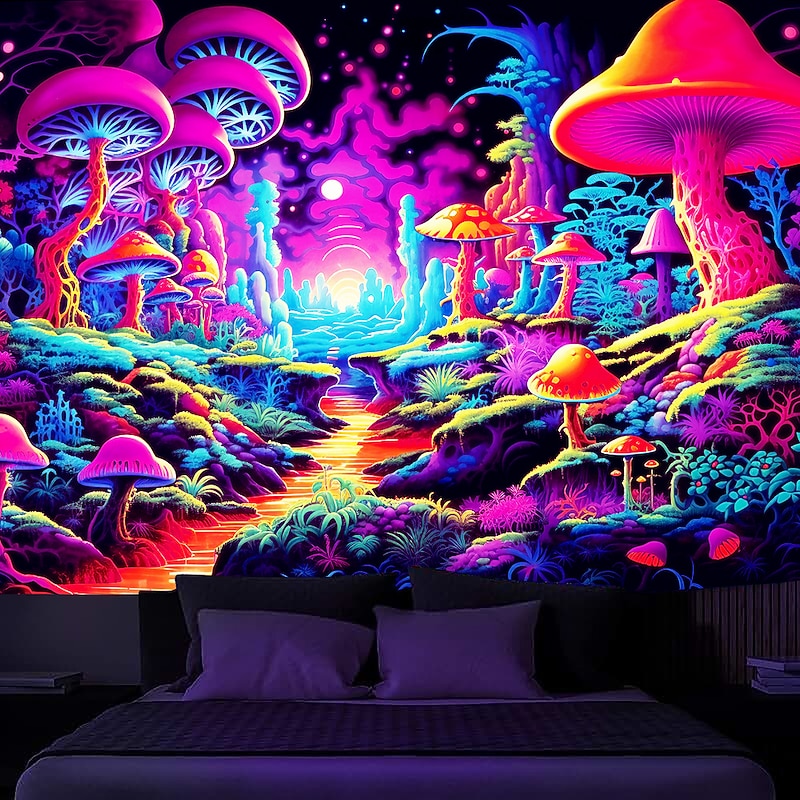HOT ! Blacklight Tapestry UV Reactive Glow in the Dark Glow Party Neon Trippy Misty Forest Mushroom Hanging Tapestry Wall Art Mural for Living Room Bedroom