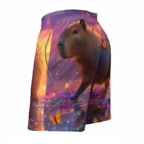 HOT ! Cute Capybara Butterfly Sunset Mens Swim Trunks Quick Dry Beach Swimming Shorts with Mesh Lining and Pockets