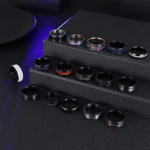 • ANXIETY RINGS BAND SET: Oner order You will get 16 different classical fidget ring: biker chain spinner ring, Wheel Rings, pure black ring, inlaid colored, smooth and frosted band ring, 7pcs spinner ring and 9pcs fixed non-rotating ring. Anxiety rings can help you relieve stress, improve mood,more styles provide more choices for your daily wear