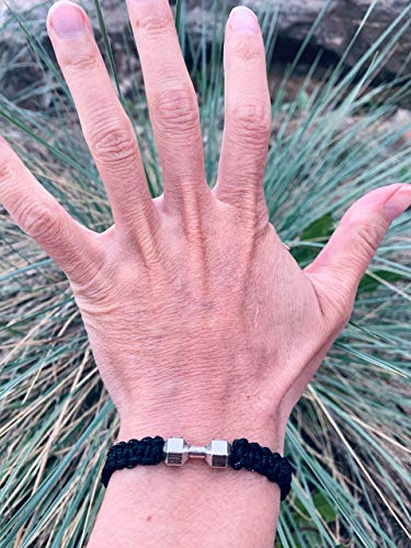 • DUMBBELL BRACELET - Black Braided Cords Weaved together with Silver Dumbbell Charm & “Where there’s a will there’s a Way” on adjustable braceleta will there’s a Way” on adjustable bracelet