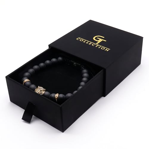 • ENERGY BALANCE GEMSTONE BRACELET FOR MEN - GT Collection Beaded Bracelets are crafted by hand using 8mm real natural Onyx beads, a golden stainless steel leopard bead, and an adjustable braided nylon cord by expert jewelry artisans