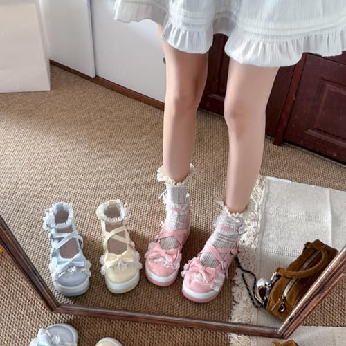 ZQW Kawaii Sweet Lace Bowknot Wedge Heels - Cute Lolita Adorable Chic Aesthetic Y2K Chunky Mary Janes Shoes for Women Goth 2