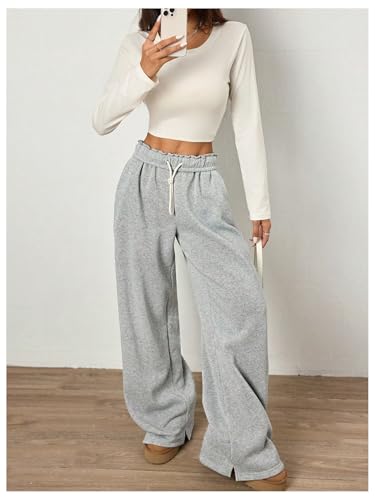 Women's Foldover Drawstring High Waisted Sweatpants Wide Leg Split Baggy Workout Trousers Pants 4
