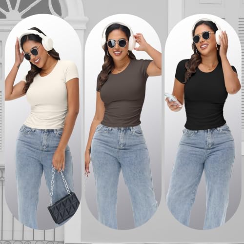 Coume 3 Pack Womens Short Sleeve Crew Neck Ruched T Shirts Summer 2025 Y2k Slim Fit Tees Stretchy Basic Tee Shirts Crop Tops 6