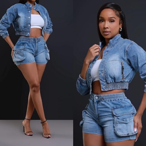 • Features:Women casual denim two piece shorts sets, long sleeve mock neck 2 piece outfits for women summer, slim stretch 2 piece short set denim jacket, elastic waist shorts, elastic hem of jackets, high waist shorts set with jean jacket, button down denim jacket top cargo shorts, jeans shorts set women crop jacket , lounge 2 piece denim set jacket, sexy denim set outfits 2 piece cargo shorts pants set cropped jacket, long sleeve denim tracksuits, summer denim outfits 2 piece set with pockets.