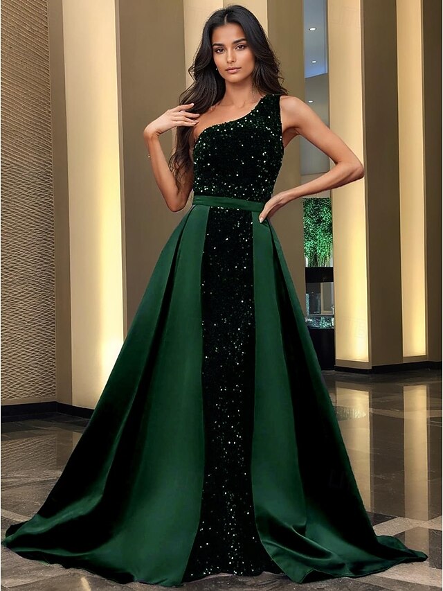 HOT ! Black Velvet Sequin Mermaid / Trumpet Evening Gown with Detachable Overskirt Elegant Dress Formal Wedding Sweep / Brush Train Sleeveless One Shoulder 2025