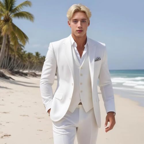 Retro Linen Suit for Men Slim Fit 3 Pieces Casual Beach Wedding Tuxedo Jacket Blazer Vest Pant Groomsmen Suits 3