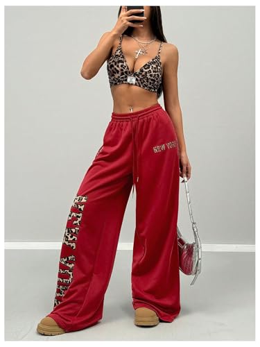 HOT ! WDIRARA Women's Leopard Letter Graphic Wide Leg Sweatpants Drawstring Waist Workout Baggy Pants