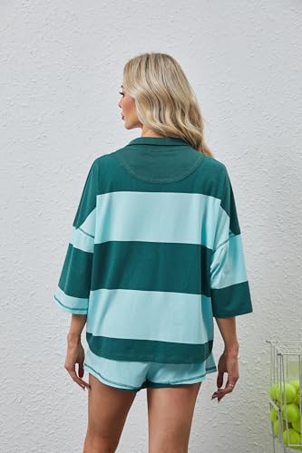 Women Two Piece Workout Short Sets Striped Lounge Set Oversized Half Sleeve Shirt and Shorts Tennis Tracksuit 6