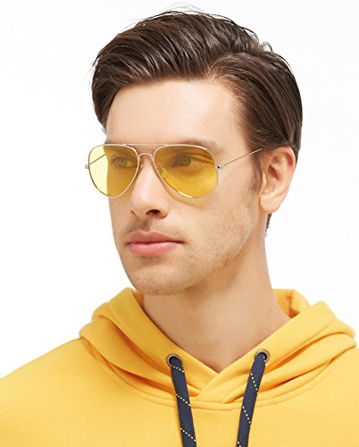 • Classic aviator design for maximum the wide-field yellow lenses, which will keep eyesight more broad than the narrow lenses. The anti-glare polarized yellow lenses provide greater clarity in fog, haze, dark and other low-light conditions,reducing contrast from bright blue / white glares & flashes which will improve your day or nighttime drive performance and reduce eyes fatigue