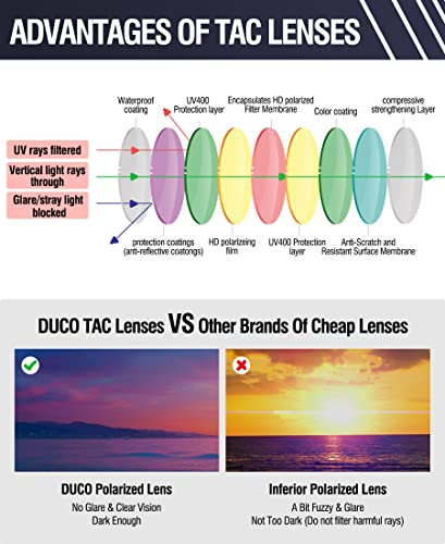 • 【UV HD Polarized Lenses】DUCO High Definition TAC Lenses Are Designed To Filter Out 99% Of Reflected Glare Minus The Haze And Distortion That Typically Comes With Conventionally. They Are Extremely Impact-Resistant, Scratch-Resistant, Lightweight And Durable. They Block 100% Of Harmful UVA, UVB & UVC Rays Up To 400nm, Restore True Color, Enhance Contrast, Make Your Eyes More Comfortable.
