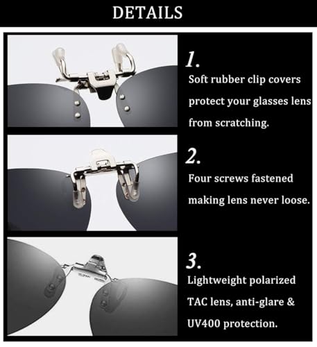 • 😎Fits Most Frames & Easy Application - Clip on your prescription glasses, fits both Metal and Plastic frames, full-frame and rimless frame except. Just clip on and go! Saving Hundreds of dollars instead of getting new prescription Sunglasses!