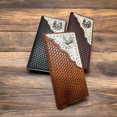 HOT ! Men’s Long Leather Wallet – Basketweave Tooled with Cowhide Inlay and Horseshoe Rooster Concho – Western Rodeo Bifold Checkbook Wallet for Ranchers & Cowboys