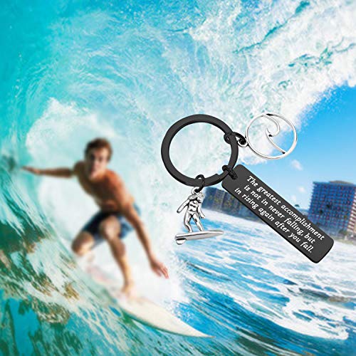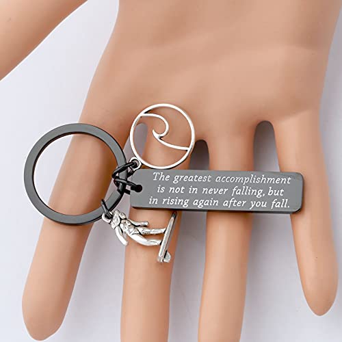 • ❥Inspirational Surfing Gifts❥Surfer Keychain Engraved with motivational words ①The greatest accomplishment is not in never falling, but in rising again after you fall.② Surfer charm ③Ocean Waves Charm. A inspirational surfer keychain gift for a surfing fan.