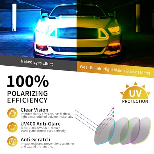 • HD NIGHTTIME DRIVING GLASSES: Kelinln Anti Glare Night Vision Glasses are designed for both men and women to travel safely at night, sports, outdoors or cloudy, rainy, foggy, to make driving safer. Yellow tint lenses can filter out about 20% of glare at night, effectively reducing the incidence of 86% of traffic accidents