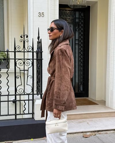 HOT ! VOIKERDR Brown Leather Jacket Women Suede Jacket Trendy Faux Suede Jacket with Belt Winter Jacket Outwear
