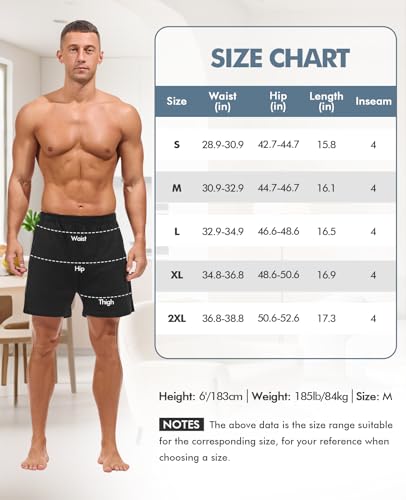 • Mens sleep shorts: Mens sleep shorts feature elastic waistband and 4 inch inseam design. Mens PJ shorts offer the excellent sleep experience that is suitable for most body types and providing sufficient air exposure for most people.