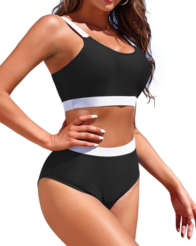 Womens High Waisted Bikini Sets Sporty Crop Top Color Block Swimwear Bandeau Scoop Neck Vintage Two Piece Bathing Suits 1