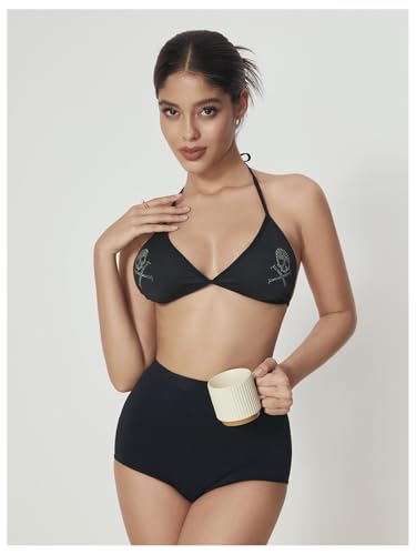 WDIRARA Women's Goth Skull Triangle Halter Bikini Top Rhinestone Tie Back Swimsuit Tops Swimwear 1