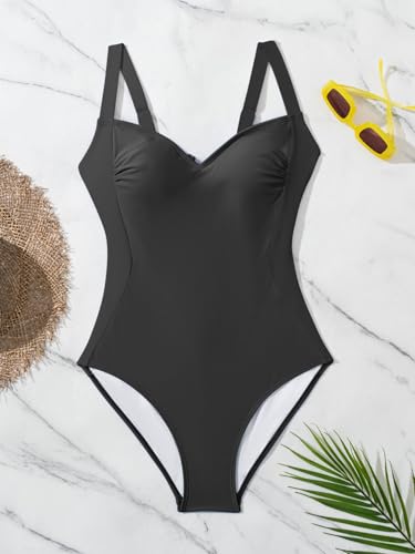 HOT ! Eomenie Women's Tummy Control One Piece Swimsuit Slimming Lace Up Back Bathing Suit V Neck Swimwear Black