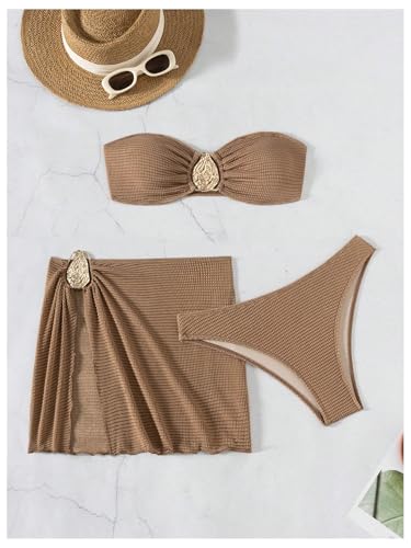 GORGLITTER Women's Strapless Swimsuits Metal Decor High Waisted Cheeky Bikini Set with Bathing Suit Cover Up Skirts 3