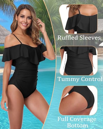 ZINPRETTY Womens Retro One Piece Bathing Suit Tummy Control Off Shoulder Swimsuit Flounce Ruffled Monokini Full Coverage 1