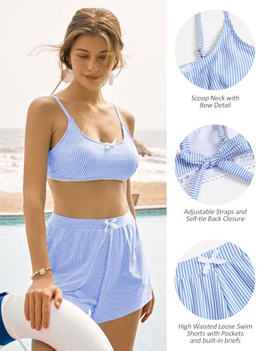 • DESIGN: Classic & Timeless Striped Bathing Suit for Women with Shorts design with scoop neck, cute micro bows and scalloped hem detail, adjustable strap and tie back closure, removable padding, high waist swim shorts with phone pockets, elastic waistband, offer you a relaxing stroll along the coast