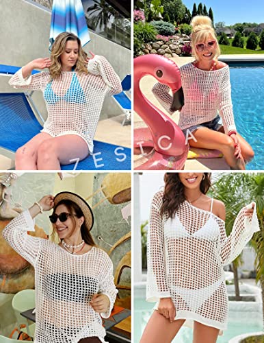 HOT ! ZESICA Women's 2025 Summer Crochet Hollow Out Long Sleeve Beach Bikini Swimsuit Mesh Cover Up Tunic Top