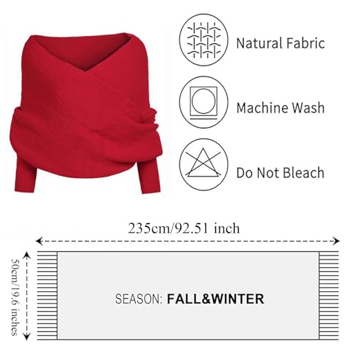 Care instructions: Hand Wash OnlyOrigin: ImportedScarf With Sleeves One Size Fits Most:Measuring 235 * 50cm/92.51 * 19.6 inch, this elastic scarf suits most sizes with a unisex design. It's a blend of comfort and style, ideal for all.Snowfall Sweater Scarf With Sleeves:The unique sleeve design, while keeping warm, adds a touch of bright spot to your clothing matching.V-Neck Can Better Modify Your lovely Neck Line And Collarbone, And The Off-Shoulder Cross Wrap Design Is Sexy And Special, Easy To Match With Different Clothes.Innovative Wrap Sensation: Slide your arms into the sleeves and drape the scarf around your neck for a warm, stylish look. This sweater scarf offers a unique and comfortable wrapping experience, setting it apart from traditional scarves.Season:This Knitted Wrap Scarf With Sleeves is perfectly suitable for autumn / spring / winter. Instantly complete your outfit and stay warm and trendy in every weather with these beautiful Knitted Wrap Scarf With Sleeves.Great Gift:Suitable for casual, party, work, date, wedding, cocktail party, nightclub and homecoming or casual everyday look. Makes a great gift for family and friends. Perfect for everyday use. supreme materials and excellent craftsmanship ensure long-lasting durability.