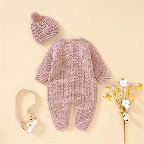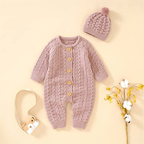 Toddler Knit Jumpsuits with Hat Button Down Crochet Ribbed Plain Sweater Rompers Baby Infant Thick Warm Bodysuits 4
