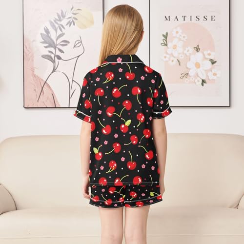 Cherry Flower Polka Dots Black Summer Pajamas Set Soft Satin Pjs Sets 2 Piece Short Sleeve Sleepwear Casual Clothes 2