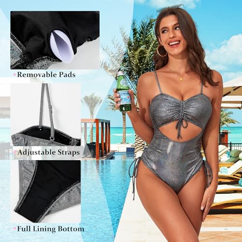 Zando Metallic Cut Out One Piece Swimsuit Women Sexy Shimmer Tummy Control Bathing Suit Sequin Bodysuit Festival Rave Outfits 1