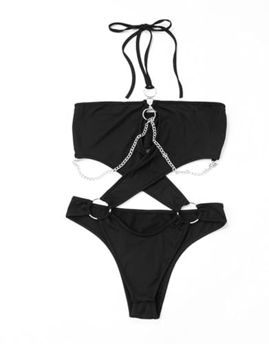 Women's Cut Out One Piece Jumpsuit Ring Backless Strappy Halter Lingerie Bodysuit Top Silver Chain Bottom Nightclub Bikini 1