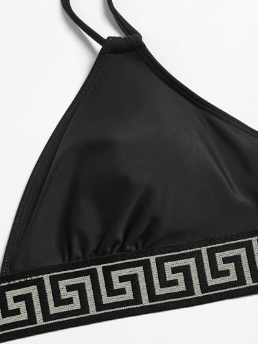 • The bikini top features a trendy halter neck and a flattering V-neckline, complete with a stylish back tie. Geometric patterned webbing adds more flair
