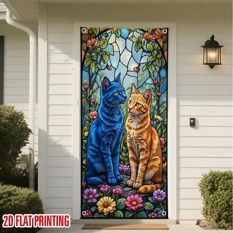 Door Cover Outdoor Banners Cat Stained Glass Aesthetic Mystic Bedroom Living Room Front Door Home Decor 5