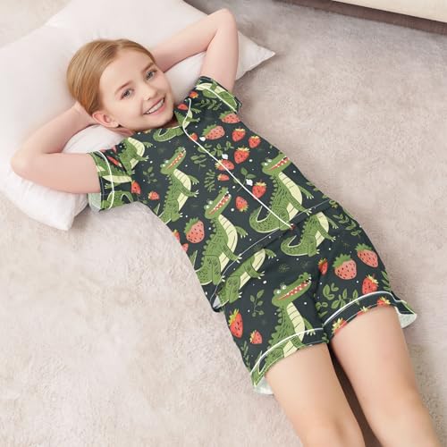 ALAZA Crocodile Strawberry Black Satin Pajamas Set Short Sleeve Button Down Sleepwear Summer Pjs 2 Piece 2