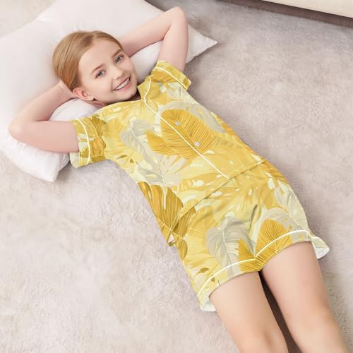 ALAZA Yellow Gold Palm Leaves Pajamas Satin Pajama Set Short Sleeve Button Down Sleepwear 1