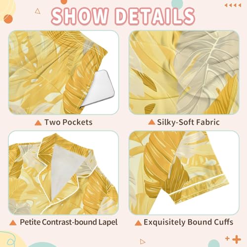 More information about ALAZA Yellow Gold Palm Leaves Pajamas Satin Pajama Set Short Sleeve Button Down Sleepwear