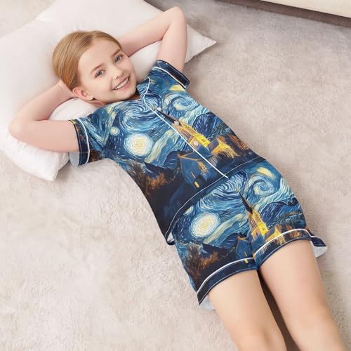 ALAZA Starry Sky House Van Gogh Satin Pajamas Set Short Sleeve Button Down Sleepwear Summer Pjs 2 Piece 1
