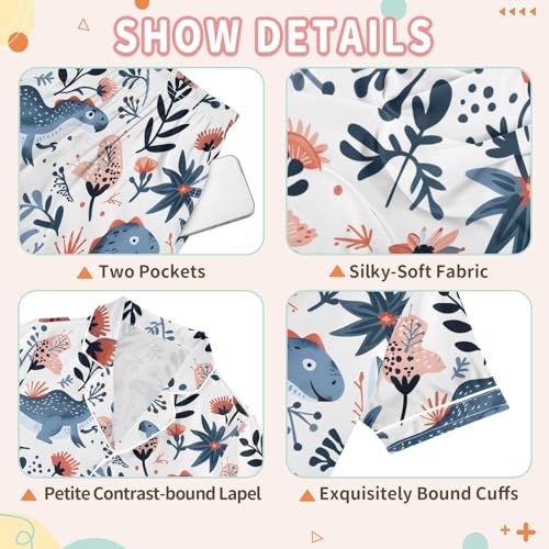 More information about ALAZA Dinosaur Leaf Blossom White Satin Pajamas Set Short Sleeve Button Down Sleepwear Summer Pjs 2 Piece