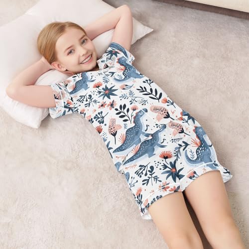 ALAZA Dinosaur Leaf Blossom White Satin Pajamas Set Short Sleeve Button Down Sleepwear Summer Pjs 2 Piece 2