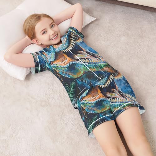 More information about ALAZA Blue Animal Dinosaur Palm Leaf Satin Pajamas Set Short Sleeve Button Down Sleepwear Summer Pjs 2 Piece