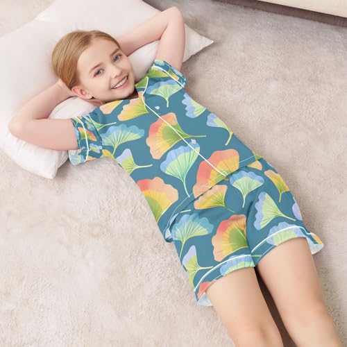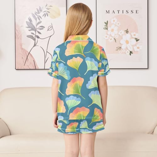 senya Ginkgo Biloba Leaves Colorful Satin Summer Pajama Sets Silk Short Sleeve Button Down Sleepwear 1