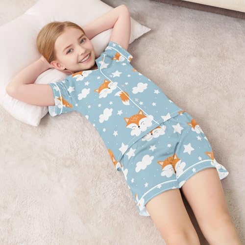 HOT ! ALAZA Fox White Cloud Pajamas Satin Pajama Set Short Sleeve Button Down Sleepwear