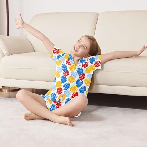 HOT ! Red Blue Yellow Monstera Leaves Pattern Summer Satin Pajama Set, Cute Button-Down Sleepwear Pj Set for Sleep Wears