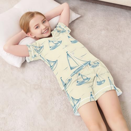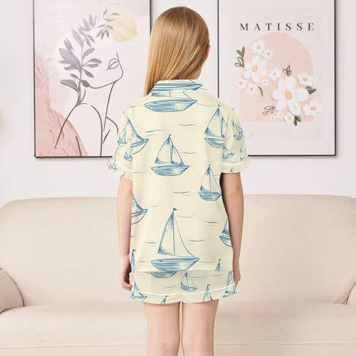 HOT ! senya Sailboat and The Art Of Lines Satin Summer Pajama Sets Silk Short Sleeve Button Down Sleepwear