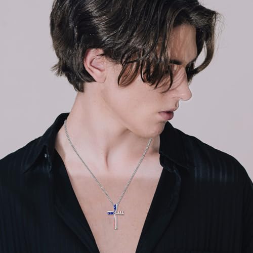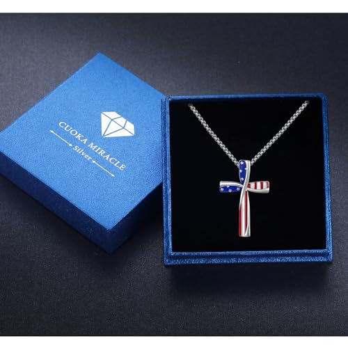 HOT ! CUOKA MIRACLE American Flag Cross Necklace 925 Sterling Silver Patriotic Jewelry Religious Cross Pendant Necklace Independence Day Patriotic Jewelry Gift for Men Women