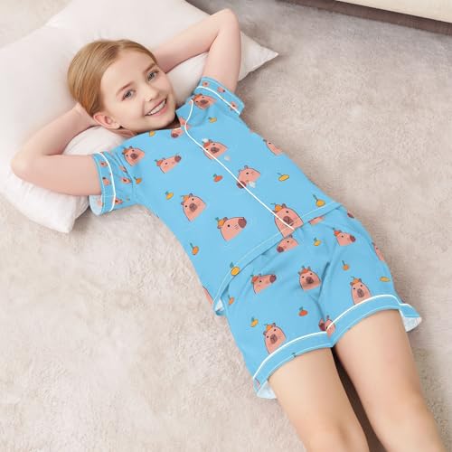 HOT ! senya Cute Capybara Bath Orange Satin Summer Pajama Sets Silk Short Sleeve Button Down Sleepwear