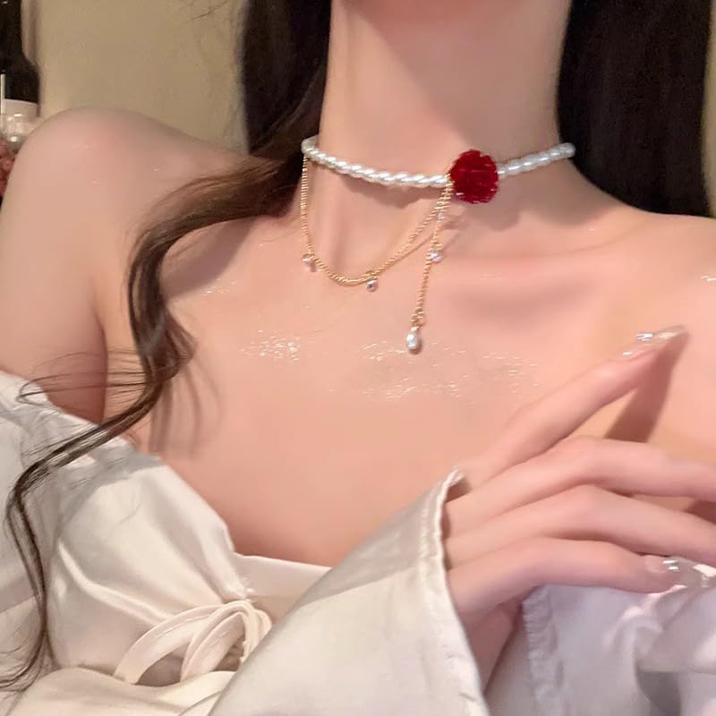 HOT ! Red Rose Flower Choker Layered Rhinestone Faux Pearl Chain Women Y2K Wedding Necklace