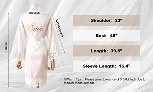 • Design Features:Gorgeous embroidery "Bride" words are printed on the back of the wedding robe. The sleeve and the bottom with the lace trim. Stylish sexy V-neck, half sleeves, inner and removable outer tie belt to ensure the perfect fit. It will make you look like more attractive and elegant, give you a unforgottable moment in the world.
